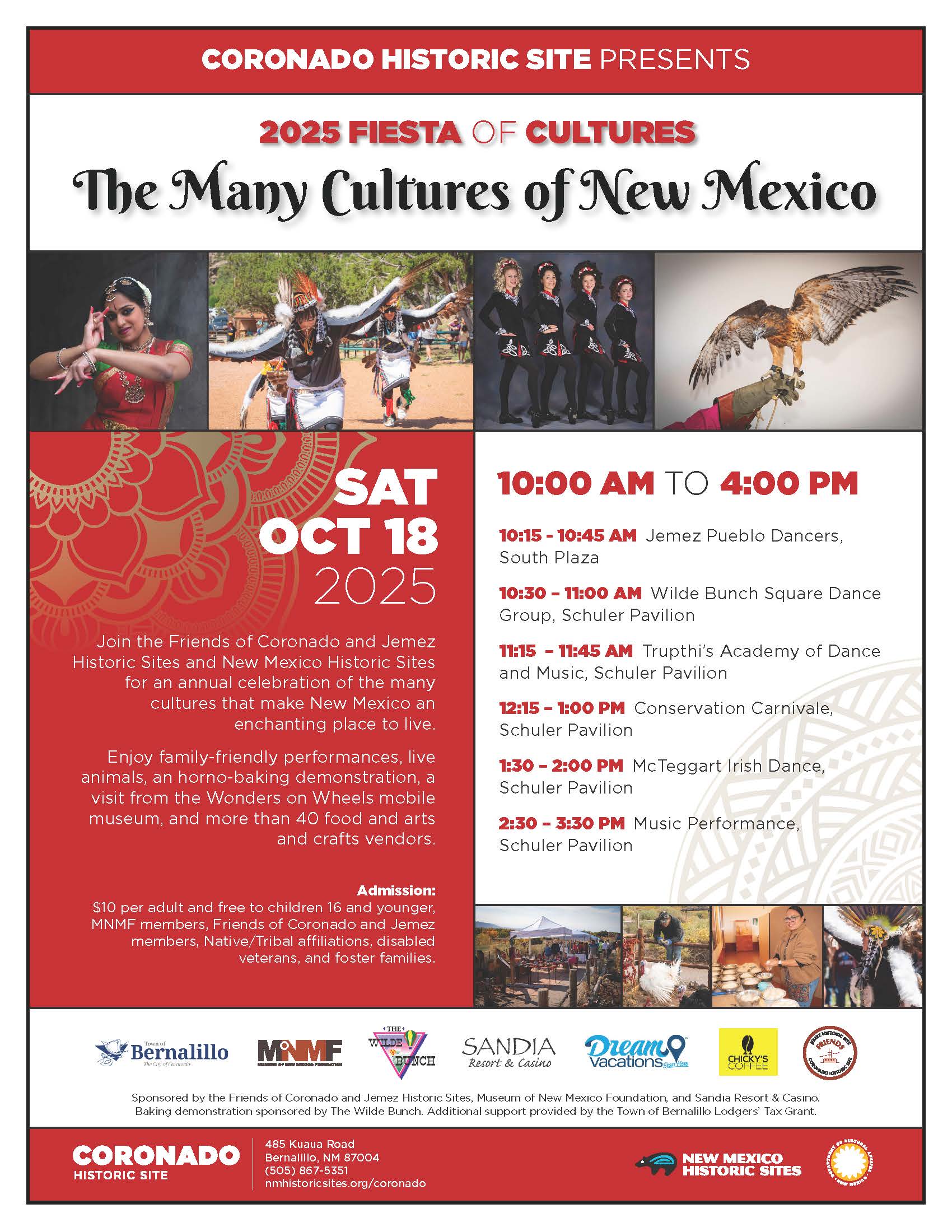 2025 FIESTA OF CULTURES The Many Cultures of New Mexico Date Oct 18 2025 Time 10:00 am - 4:00 pm Location Coronado Historic Site 485 Kuaua Rd, Bernalillo, NM 87004 Category Arts & Culture Events Fairs & Festivals Food & Drink Share this event