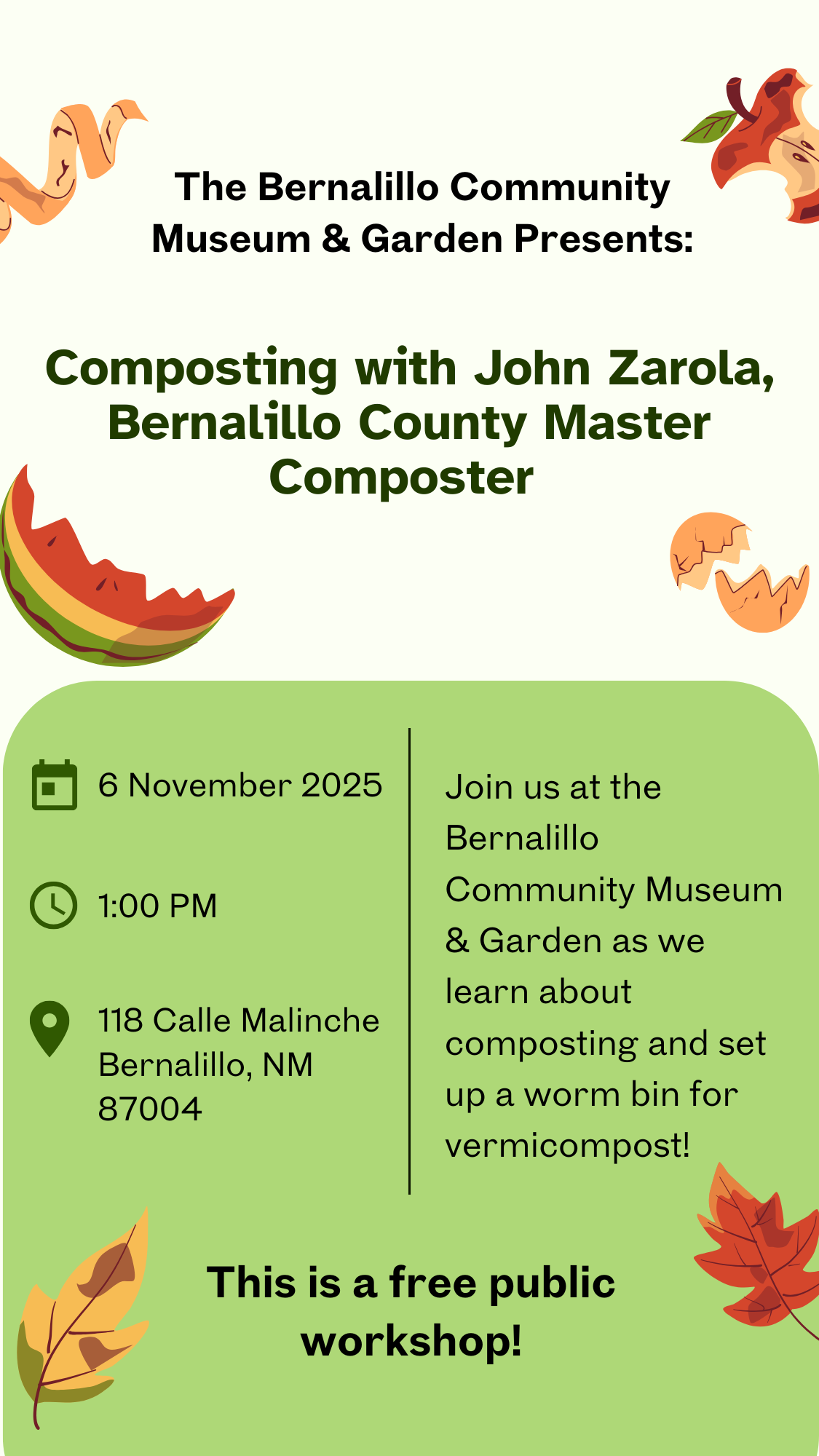 Composting w/John Zarola Date Nov 06 2025 Time 1:00 pm - 2:00 pm Location 118 Calle Malinche, Bernalillo, NM 87004 118 Calle Malinche, Bernalillo, NM 87004 Category Events Share this event