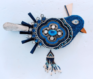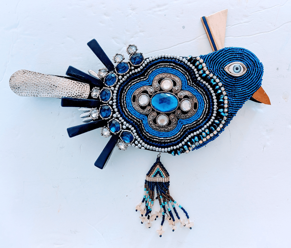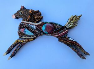 Katie Thomas grew up in Connecticut and worked in the corporate world for 25 years. She migrated to Taos where she opened and operated a store for 13 years. She now lives in Placitas where she devotes her time to exploring different art mediums, including beading, mosaics, textile art, found items, assemblage, and more.