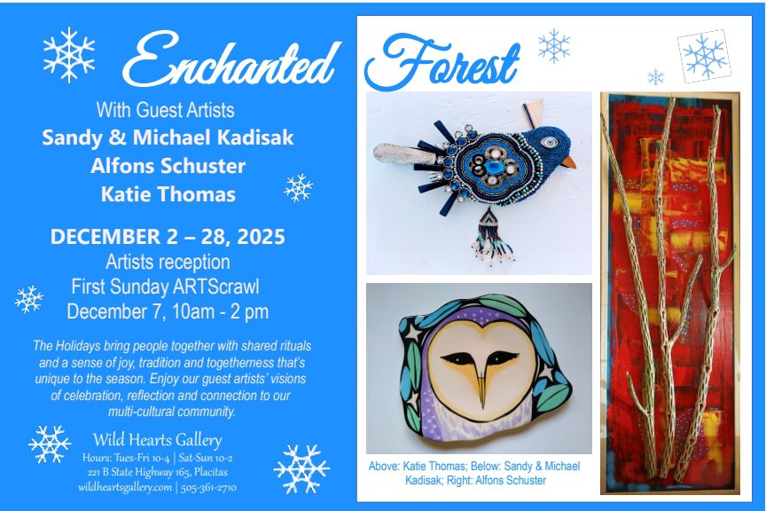 The Holidays bring people together with shared rituals and a sense of joy, tradition and togetherness that is unique to the season. Enjoy the gallery’s Enchanted Forest with twinkling lights and the artists’ imagery of celebration, reflection and connection.