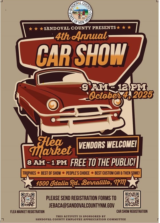 Fourth Annual Sandoval County Car Show and Flea Market Date Oct 04 2025 Expired! Time 8:00 am - 1:00 pm More Info Press Release Location 1500 Idalia RdBernalillo, NM 87004 1500 Idalia RdBernalillo, NM 87004 Category Events Share this event
