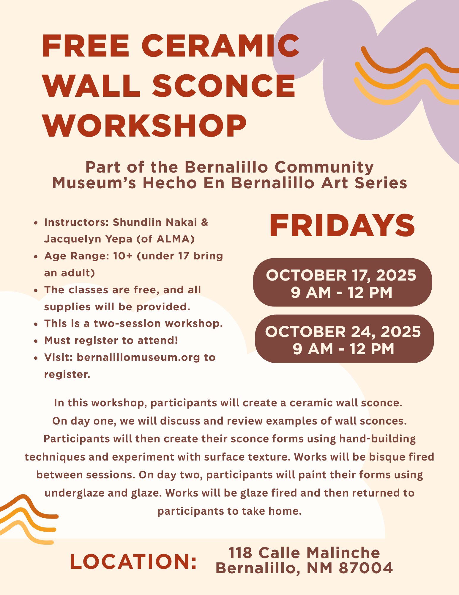 FREE CERAMIC WALL SCONCE WORKSHOP Date Oct 24 2025 Time 9:00 am - 12:00 pm Location 118 Calle Malinche, Bernalillo, NM 87004 118 Calle Malinche, Bernalillo, NM 87004 Category Arts & Culture Fall Events Share this event