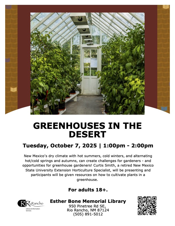Greenhouses in the Desert Date Oct 07 2025 Expired! Time 1:00 pm - 2:00 pm More Info Read More Location Esther Bone Public Library 950 Pinetree Rd SE, Rio Rancho, NM 87124 Category Events Share this event