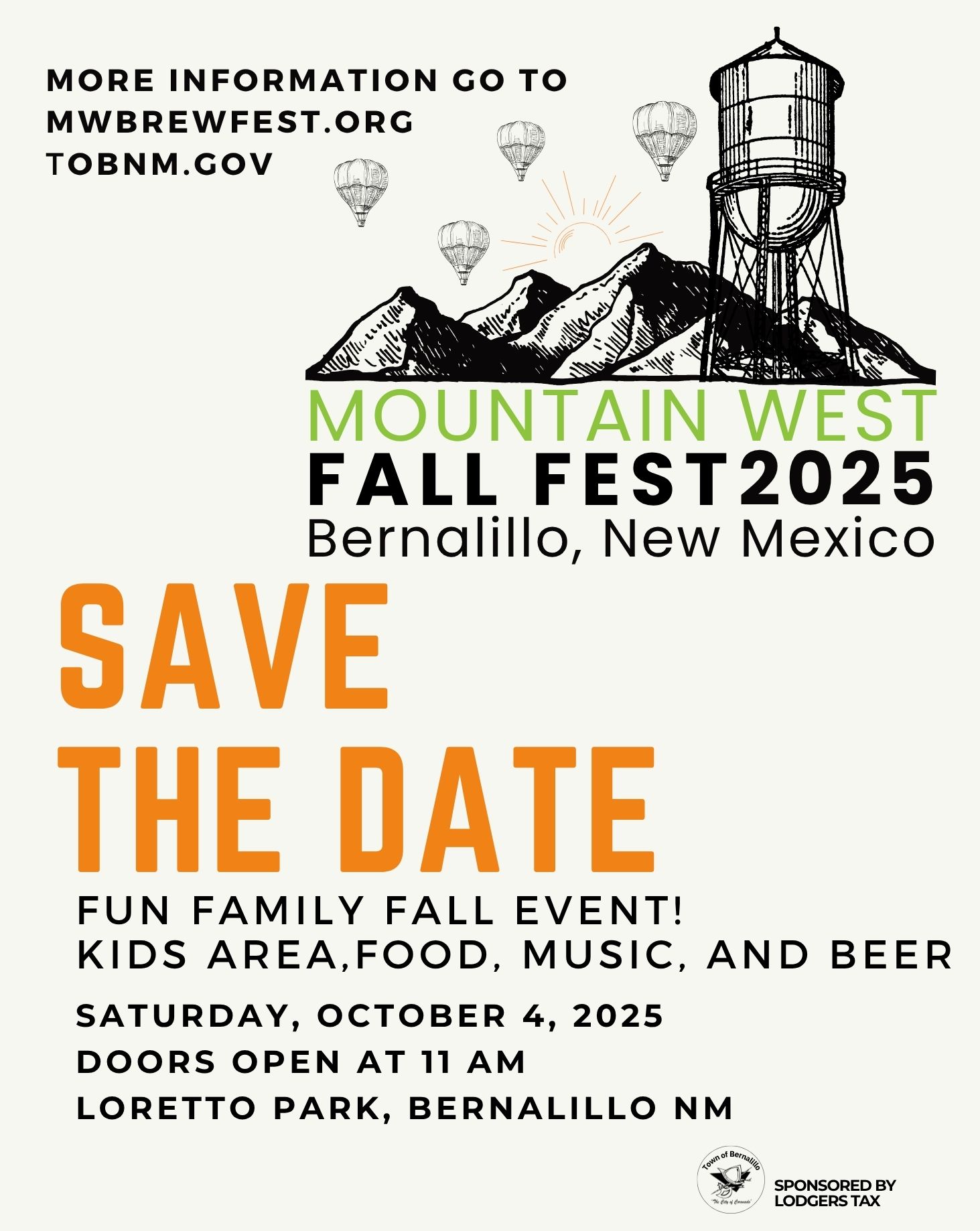 Mountain West Harvest Festival Date Oct 04 2025 Expired! Time 11:00 am Location Loretto Park, 237 Camino del Pueblo Bernalillo, New Mexico Category Events Fairs & Festivals Food & Drink Music Share this event