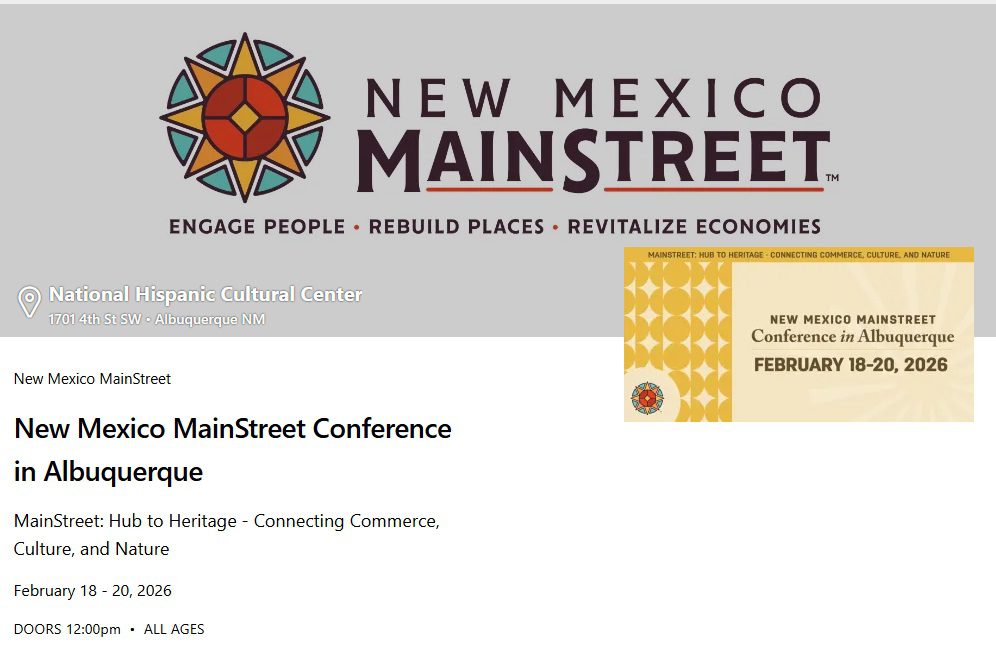 NM MainStreet Conference DateFeb 18 - 20 2026Expired! LocationNational Hispanic Cultural Center1701 4th St. SW, Albuquerque NM 87102 Category Arts & Culture Winter EventsShare this event