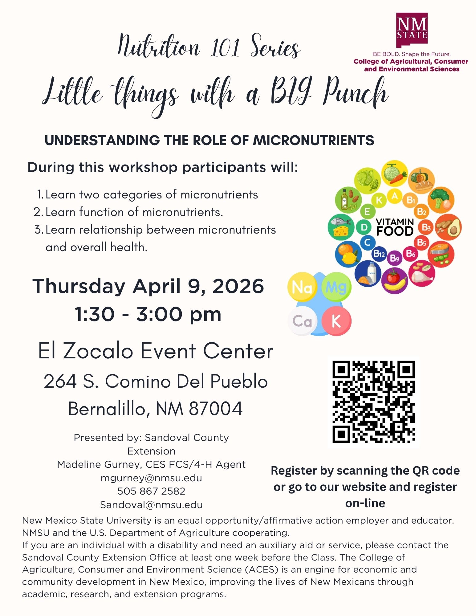 Nutrition 101 Micronutrients DateApr 09 2026Expired! Time 1:30 pm - 3:00 pm More InfoRegister Here LocationEl Zocalo Event Center264 S. Camino del Pueblo Bernalillo, NM Category Arts & Culture Spring EventsShare this event