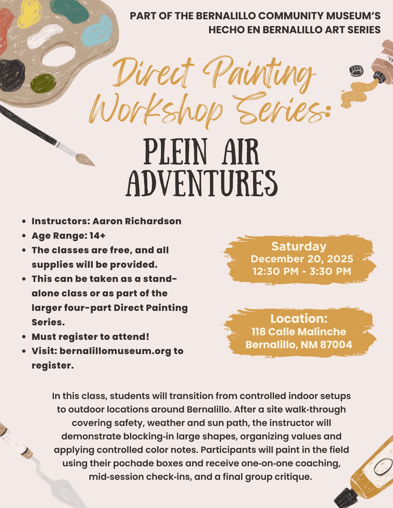 Direct Painting Workshop Series: PLEIN AIR ADVENTURES Date Dec 20 2025 Time 12:30 pm - 3:00 pm Location 118 Calle Malinche, Bernalillo, NM 87004 118 Calle Malinche, Bernalillo, NM 87004 Category Arts & Culture Fall Events Share this event