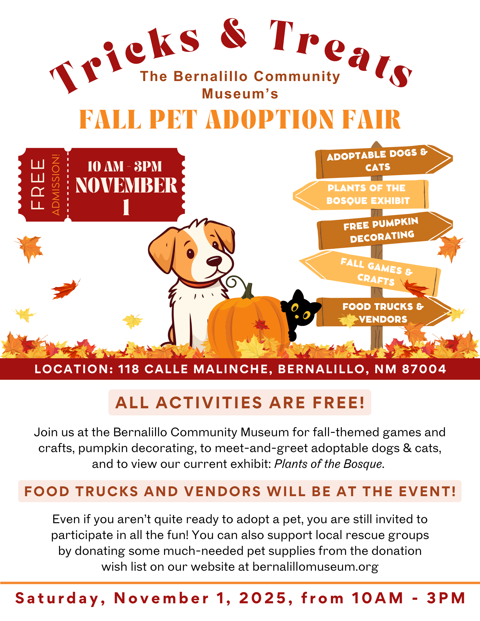 Tricks & Treats Fall Pet Adoption Fair Date Nov 01 2025 Time 10:00 am - 3:00 pm Location 118 Calle Malinche, Bernalillo, NM 87004 118 Calle Malinche, Bernalillo, NM 87004 Category Events Share this event